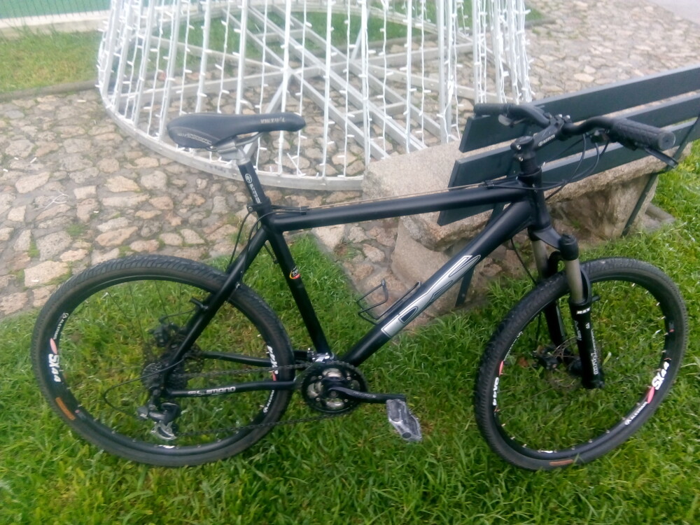 Bicicleta de BTT, marca Ds, cor preta e cinzenta,roda 26, quadro m alumínio,18pol,46cm. Velocidades 3x8 com desviadores Shimano frente e traseira.Rodas com pneus de estrada 26x1,90.